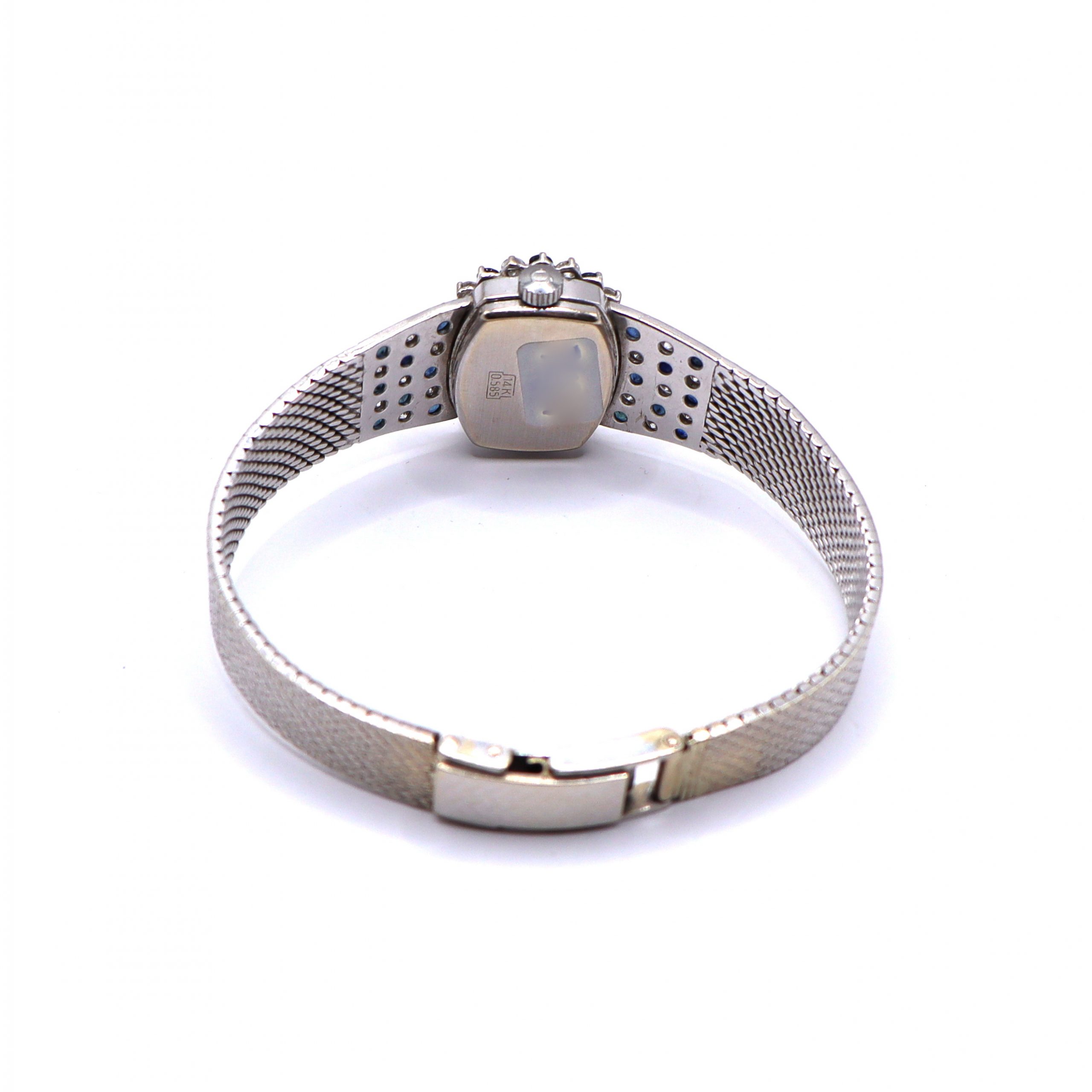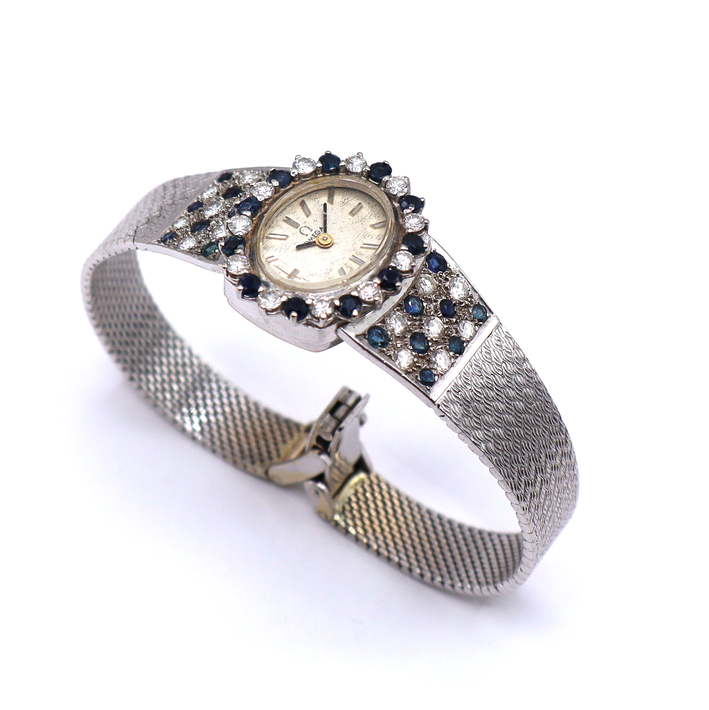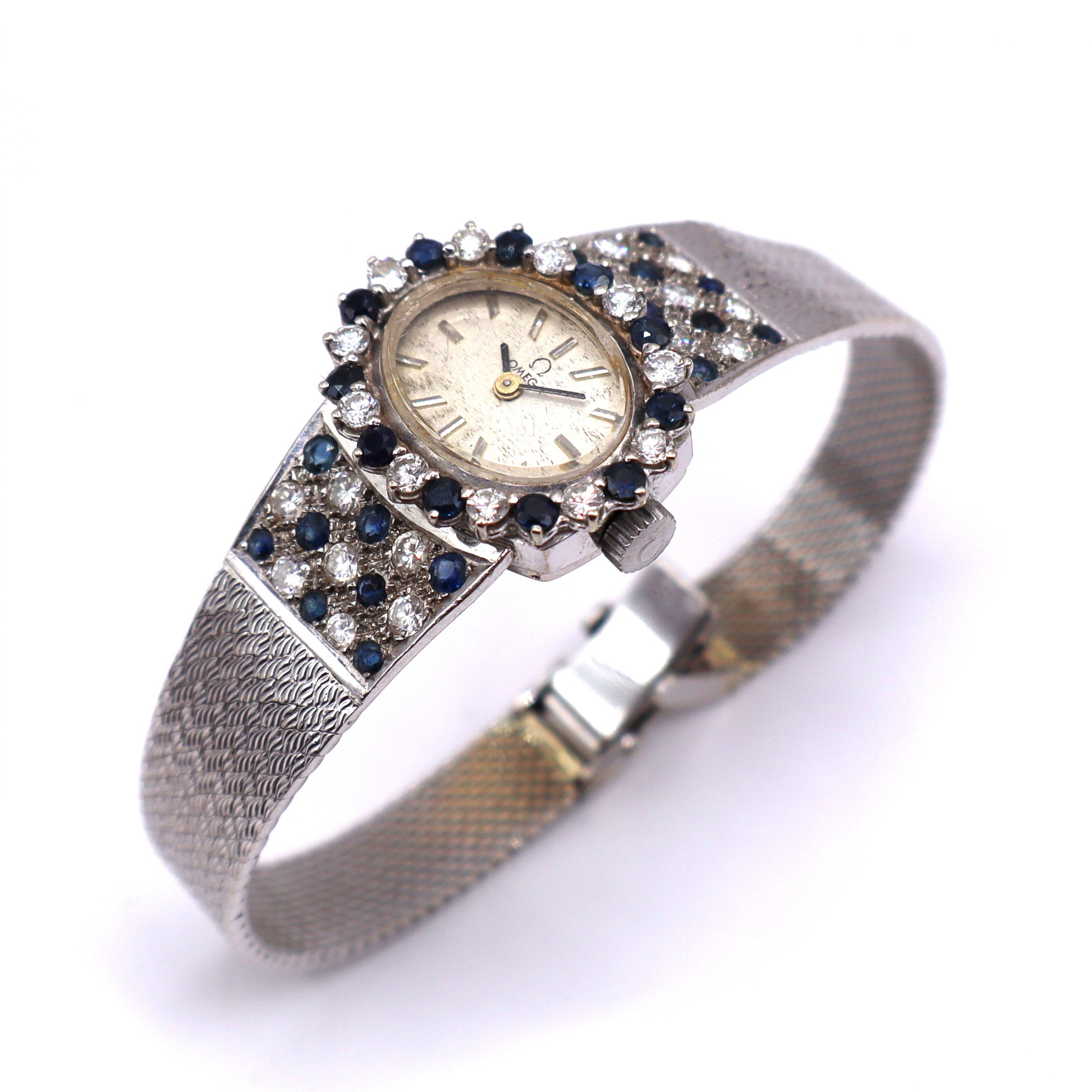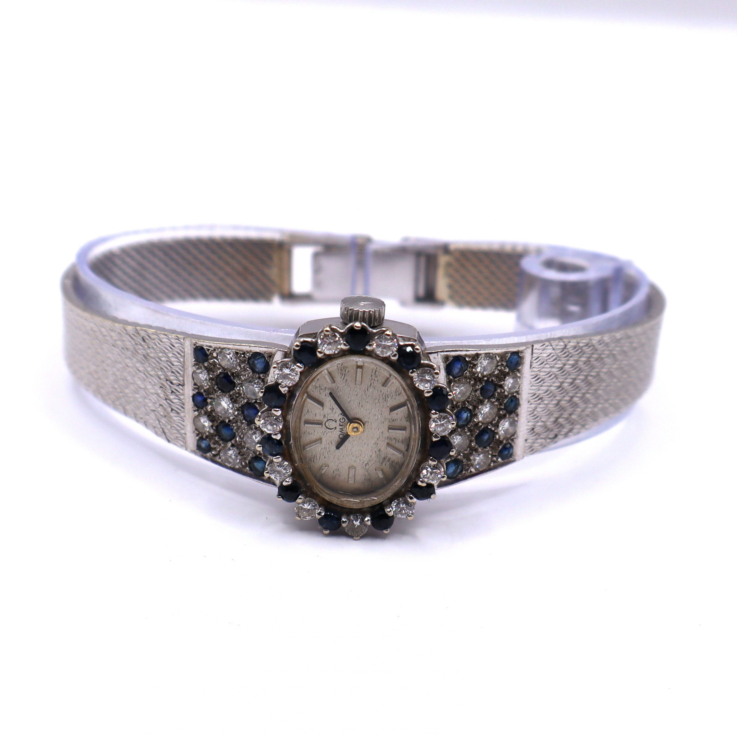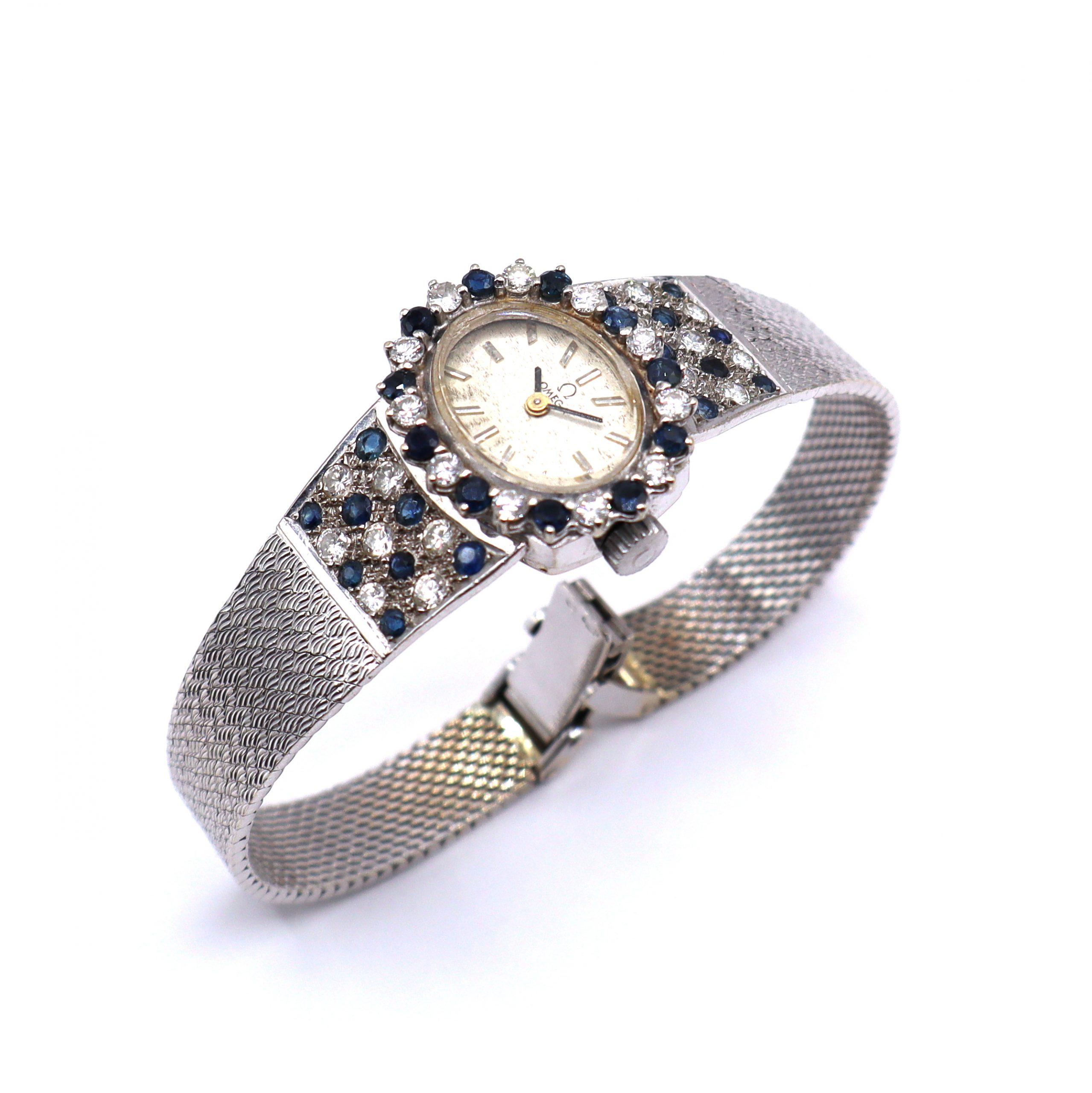 MODELO : Reloj Omega vintage en oro blanco de 14 quilates con brillantes y zafiros, mecanismo cuerda .